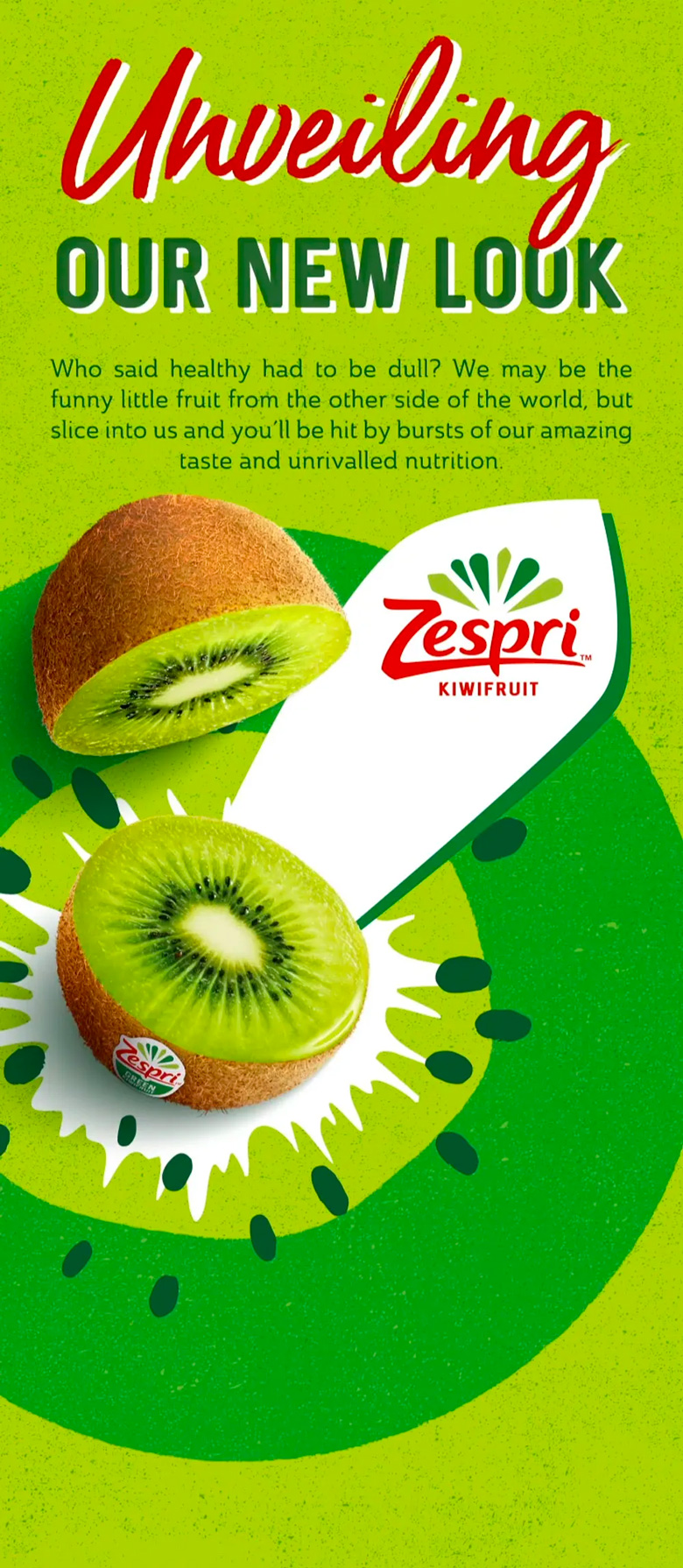 较之前来说,新LOGO不在着重展示奇异果的特点,而是用明亮的色彩和图形捕捉消费者因咬入Zespri奇异果而产生的口感。
